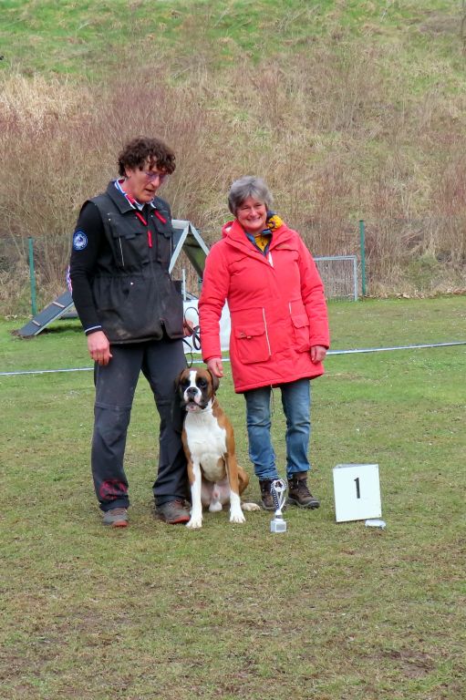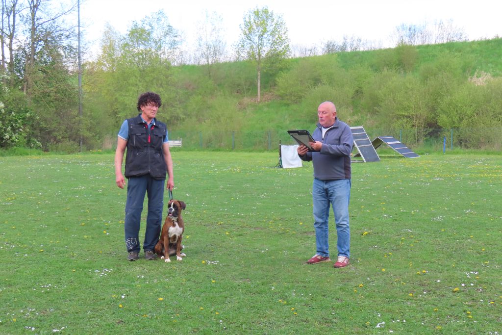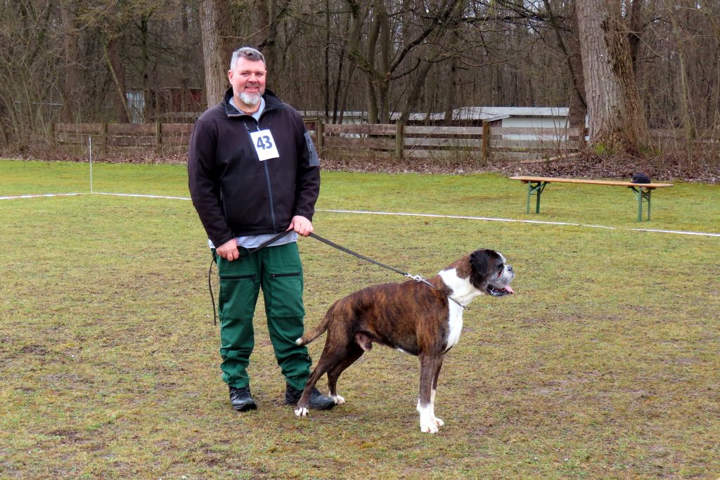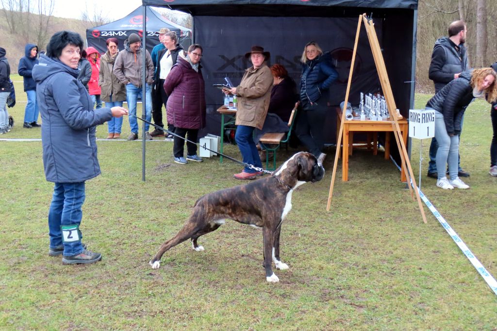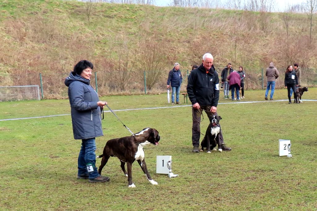 Die interessierten Boxerfreunde führten ihre Hunde im abgesteckten Ring vor, bei durchaus eisigen Temperaturen. Unter Realbedingungen konnte das Verhalten im Ring und Vorführen der Hunde geübt werden. Es stellte sich heraus, dass es doch umfangreicher und trainingsintensiver war als gedacht. Beate Jodl zeigte jedem Teilnehmerteam die Verbesserungspotentiale auf. Im Ergebnis hatte wohl jedes Team noch „Luft nach oben“, was bedeutet, auch Ausstellen will trainiert sein.