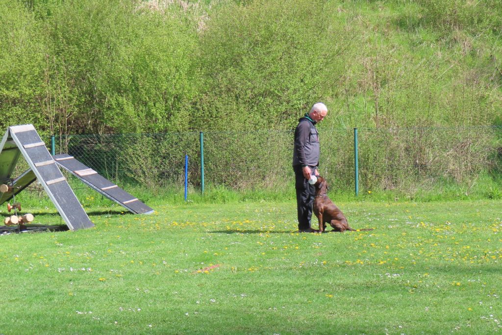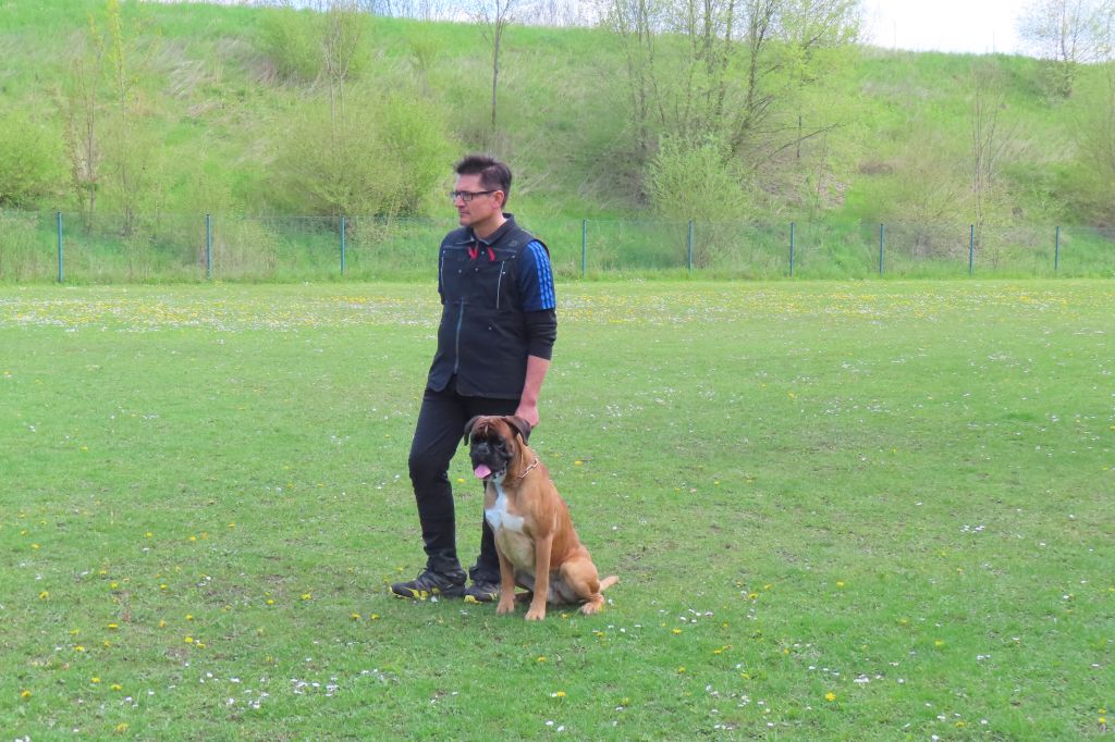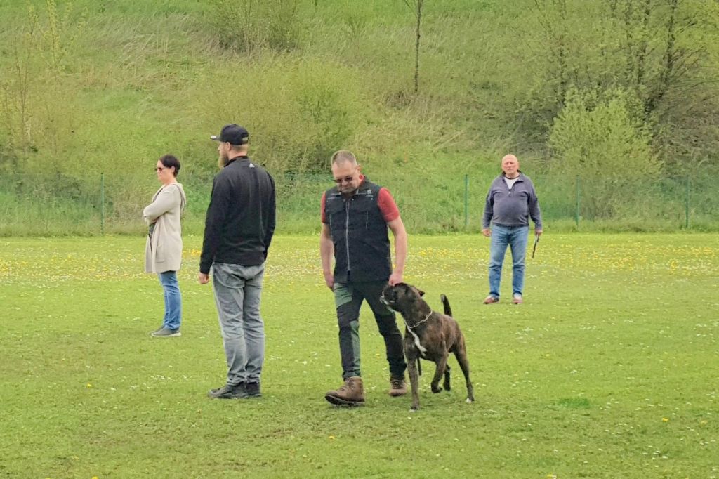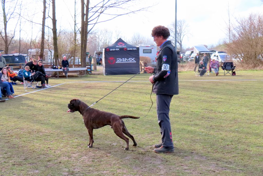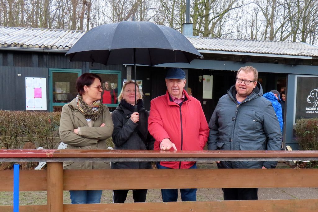 Die interessierten Boxerfreunde führten ihre Hunde im abgesteckten Ring vor, bei durchaus eisigen Temperaturen. Unter Realbedingungen konnte das Verhalten im Ring und Vorführen der Hunde geübt werden. Es stellte sich heraus, dass es doch umfangreicher und trainingsintensiver war als gedacht. Beate Jodl zeigte jedem Teilnehmerteam die Verbesserungspotentiale auf. Im Ergebnis hatte wohl jedes Team noch „Luft nach oben“, was bedeutet, auch Ausstellen will trainiert sein.